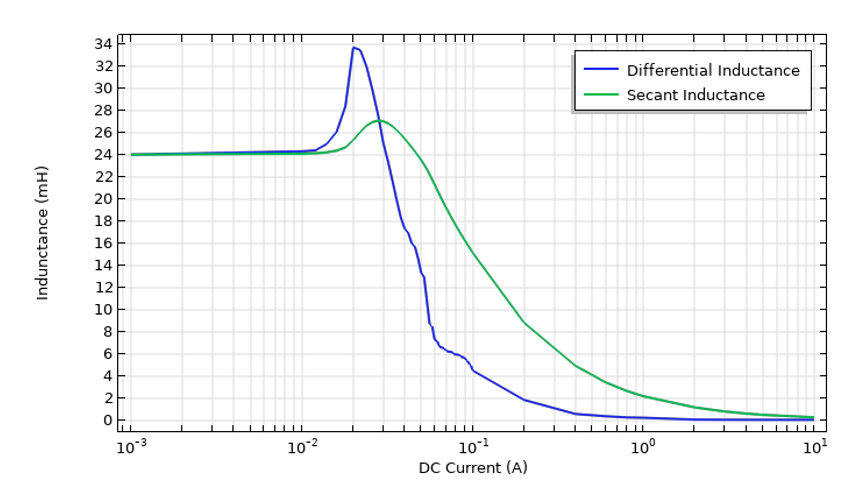 Differential and secant inductance of the inductor with a nonlinear magnetic core material over a range of applied DC currents.